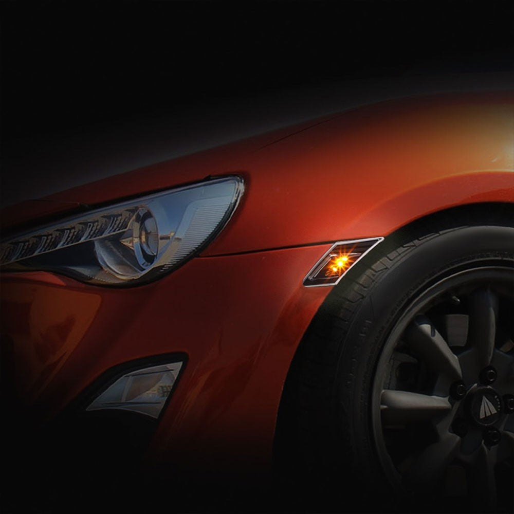 Side markers make the vehicle’s presence, position and direction of travel clearly visible from oblique angles. They improve visibility for other drivers for increased safety. With LED Side markers, they’re brighter and have the added function of wiring in a additional turn signal onto them.